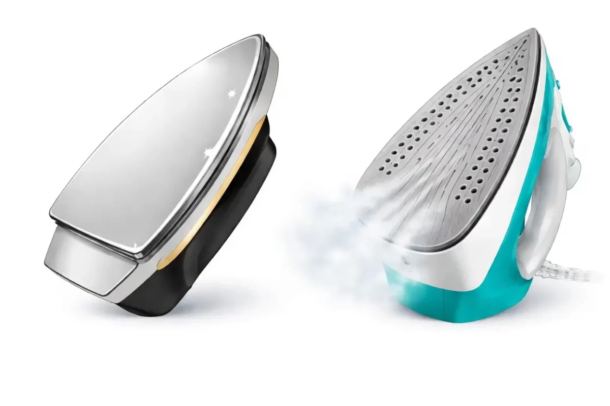 Cấu tạo mặt đế nhẵn thín của bàn ủi khô (trái) và mặt đế lỗ chỗ để phun sương của bàn ủi hơi nước (phải)