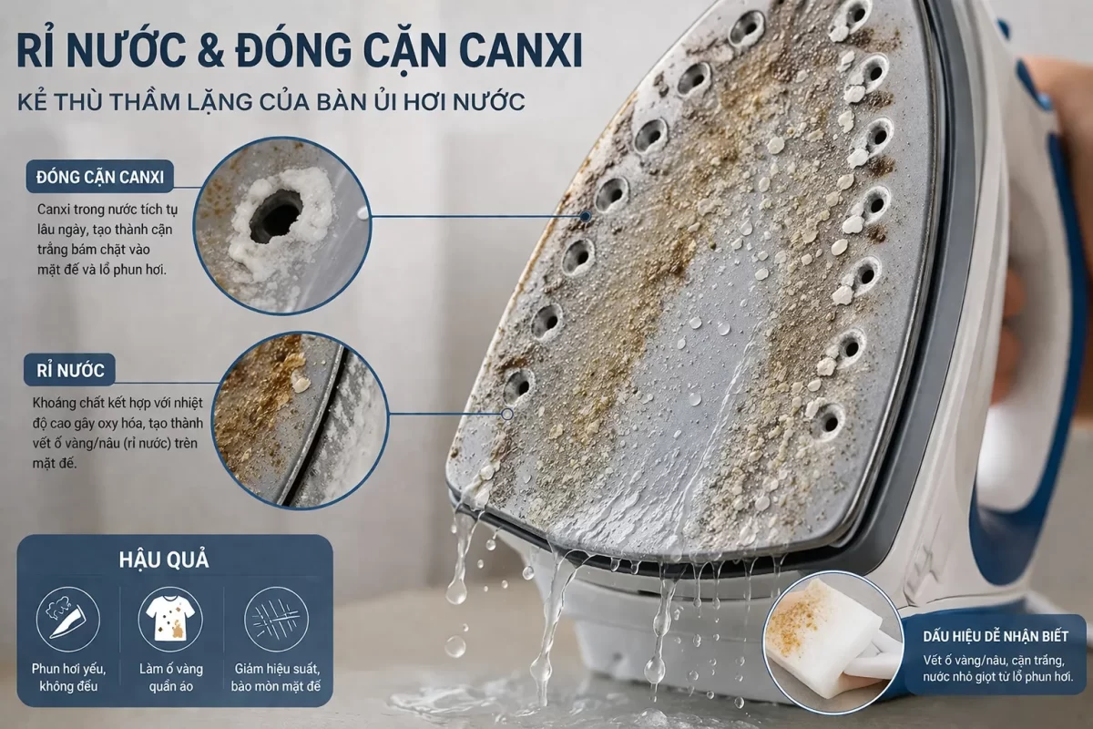 Bàn ủi hơi nước ủi đồ rất lẹ, nhưng nó mang theo một căn bệnh kinh điển mà thợ nào cũng ngán ngẩm: Đóng cặn vôi (Canxi).
