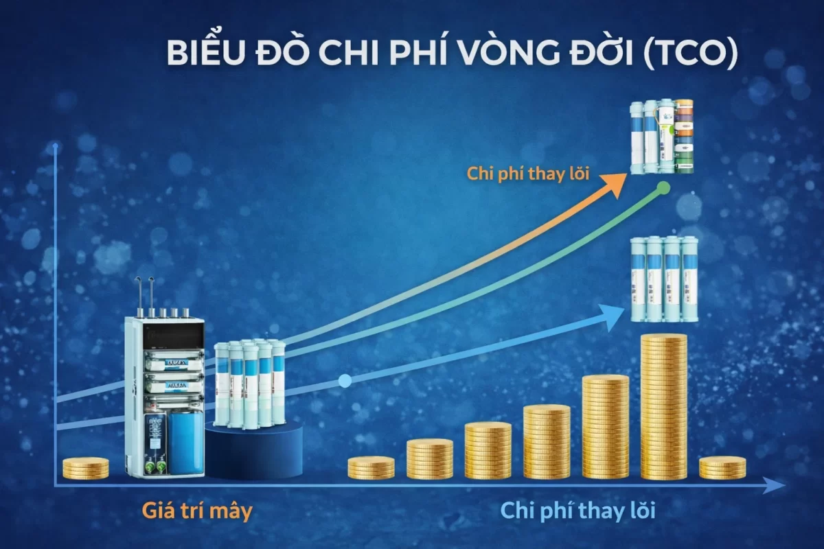 Biểu đồ phân rã chi phí vòng đời (TCO): Chi phí mua máy ban đầu (CAPEX) chỉ chiếm khoảng 40% – 50% tổng chi phí sở hữu, phần còn lại là định mức ngân sách bắt buộc (OPEX) dành cho việc thay thế các lõi lọc đúc nguyên khối theo chu