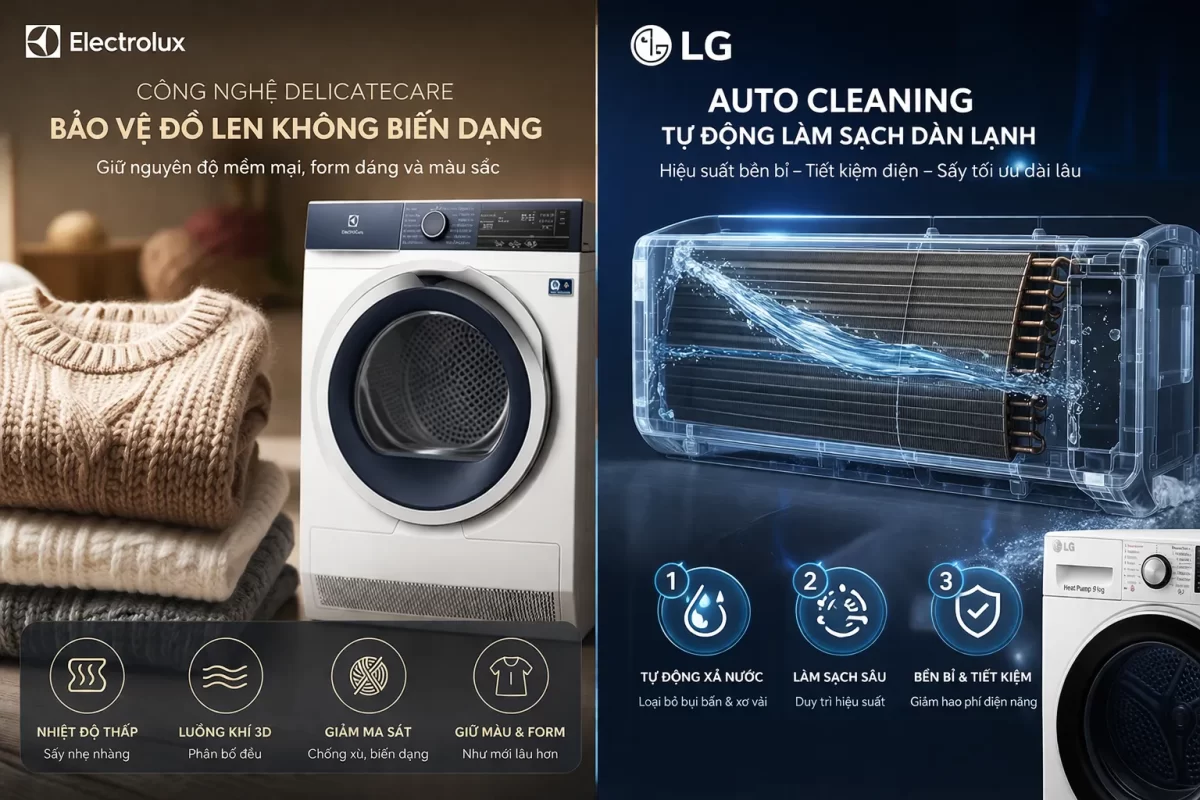 | Công nghệ lõi | DelicateCare (Bảo vệ đồ len/lụa số 1) | Dual Inverter (Máy nén kép, sấy nhanh) |
