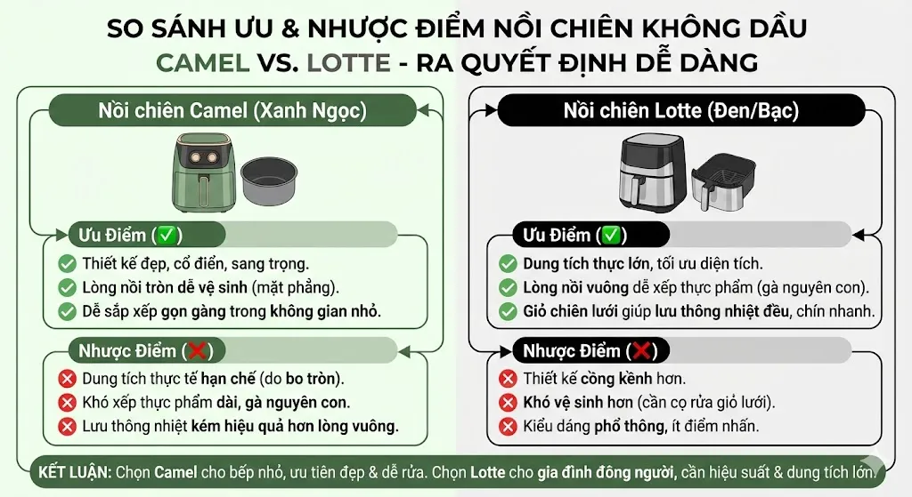 Bài viết này sẽ so sánh nồi chiên không dầu Camel và Lotte một cách chân thực nhất, không tô vẽ, giúp bạn đưa ra quyết định “xuống tiền” chính xác mà không phải hối tiếc.