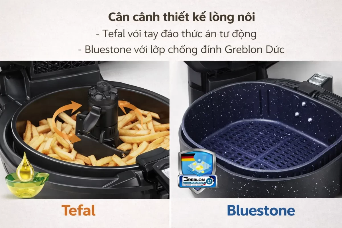 Đây là phần quan trọng nhất khi so sánh nồi chiên không dầu Tefal và Bluestone.