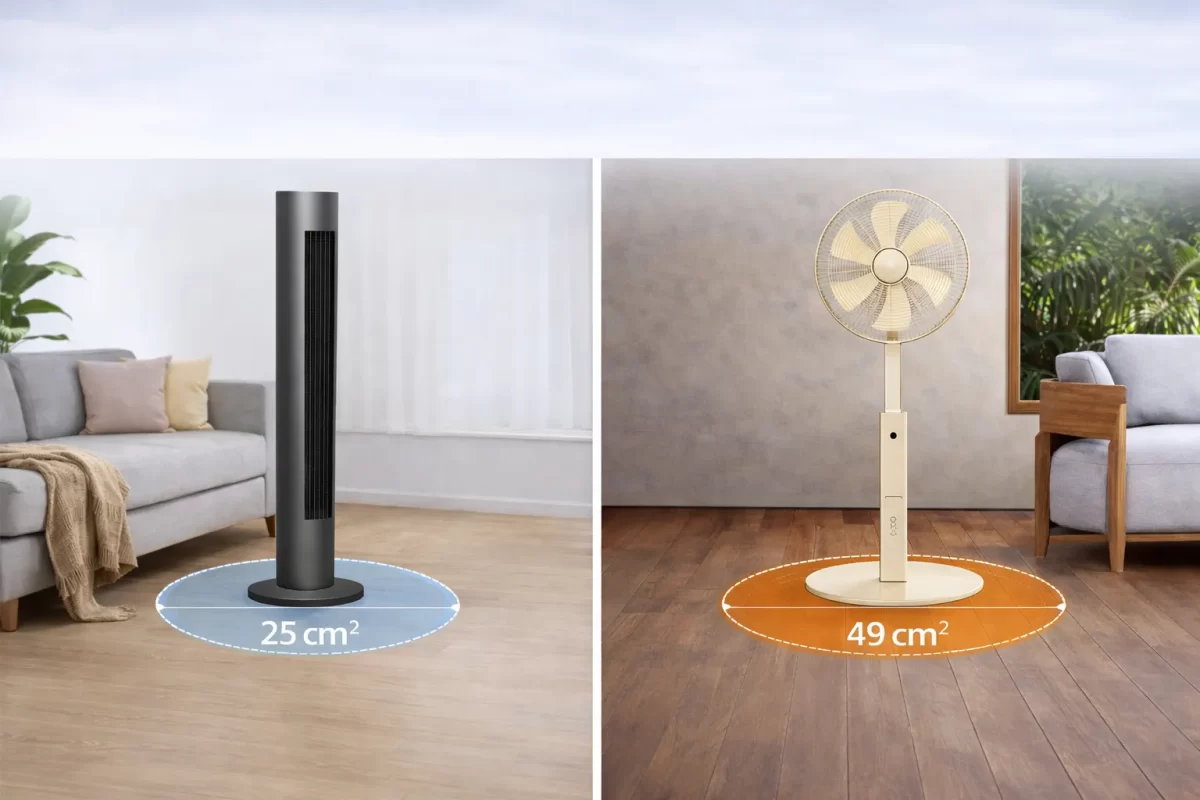 Tối ưu hóa không gian mặt bằng: Quạt tháp (trái) giảm thiểu hệ số chiếm dụng sàn (Footprint) xuống mức tối thiểu, dễ dàng tích hợp vào góc hẹp, khác với thiết kế đế bành trướng của quạt cây (phải)