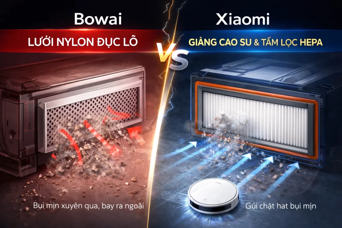 - Cấu trúc Bowai: Không có bộ lọc chuẩn. Nó chỉ có một lớp lưới nylon thô sơ đục lỗ to tướng. Khi mô-tơ cánh quạt quay, rác to thì lọt vào hộp, nhưng toàn bộ bụi mịn (PM2.5), lông tơ chó mèo sẽ bị hút vào và lập tức thổi thốc ngược trở lại ra không khí thông qua khe tản nhiệt. Bowai biến thành một cái “máy khuấy bụi” đúng nghĩa, làm cả căn nhà bạn đặc quánh bụi lơ lửng.
