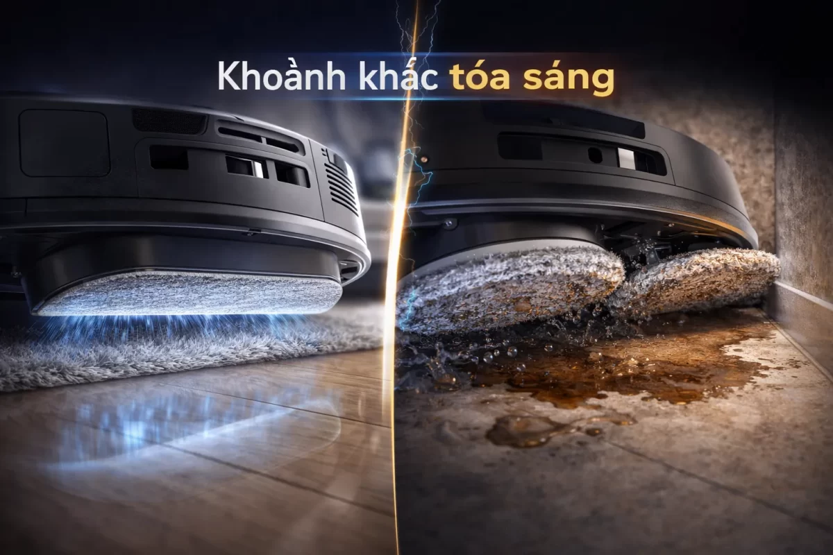 Có một sự thật mà bất cứ ai đã từng mua robot hút bụi thế hệ cũ (trước năm 2021) đều phải cay đắng thừa nhận: Chức năng lau nhà của chúng thật vô dụng! Vào thời điểm đó, các hãng chỉ đơn giản là gắn một miếng vải mỏng dính hình bán nguyệt dưới gầm máy, bơm một chút nước cho ướt, rồi để con robot… kéo lê miếng vải đó đi khắp nhà. Nó không tạo ra bất kỳ một lực chà xát nào. Kết quả là, bụi bặm thì biến thành bùn lầy, còn vết nước mắm hay vệt cà phê khô thì bị kéo thành một vệt dài bẩn thỉu từ bếp ra tận phòng khách.