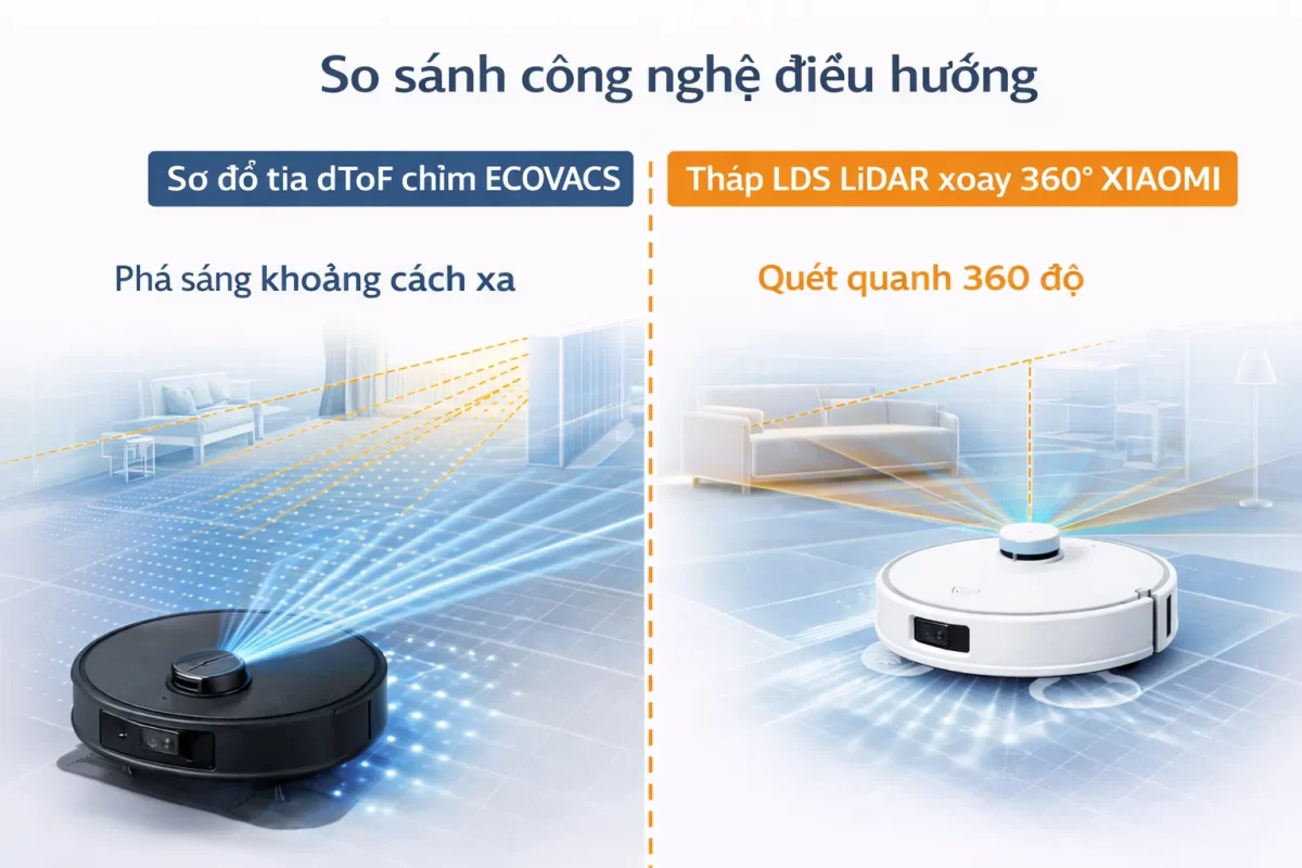 2.1. Công Nghệ Quét Không Gian: dToF (Ecovacs) vs. LDS LiDAR (Xiaomi)